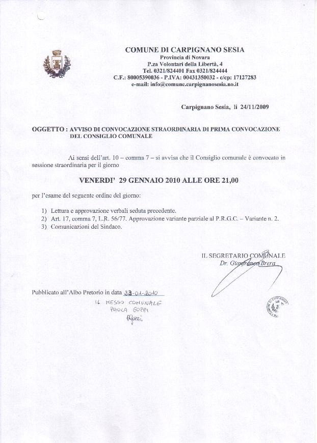 Il Consiglio comunale è convocato in sessione straordinaria per il giorno di venerdì 29 gennaio 2010