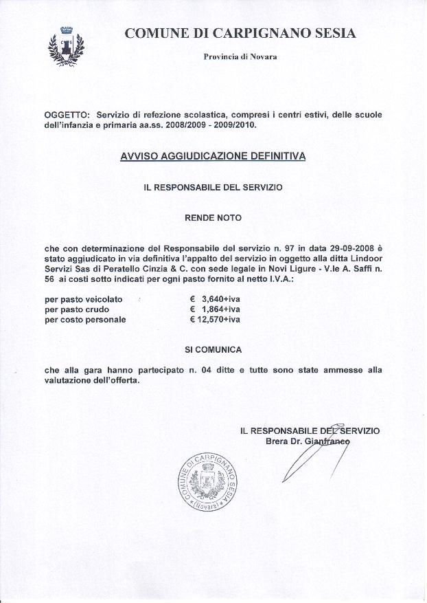BANDO DI GARA PER L'AGGIUDICAZIONE DEL SERVIZIO DI REFEZIONE SCOLASTICA SCUOLA DELL'INFANZIA E SCUOLA PRIMARIA E CENTRI ESTIVI AA.SS. 2008/2009 E 2009/2010 - C.I.G. 01916434CD